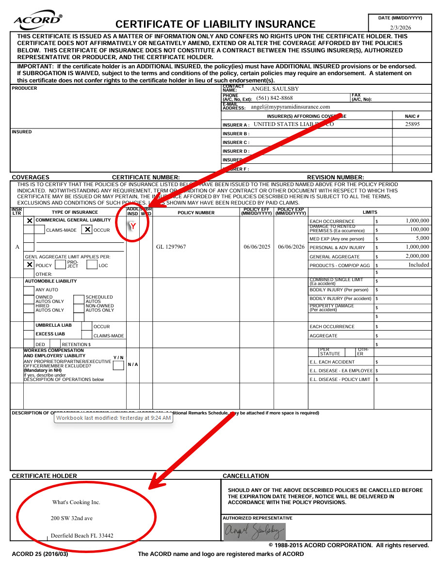 - PDF of GL Insurance Acord with the following additional insured: